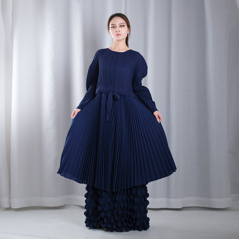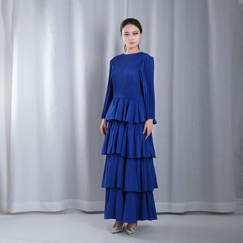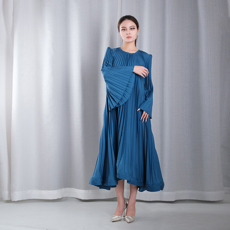 solid color pleated overlay boat Neck lantern sleeve straight loose full dresses evening gowns in blue
