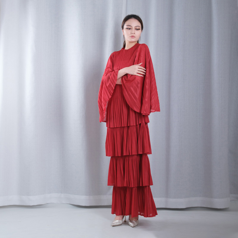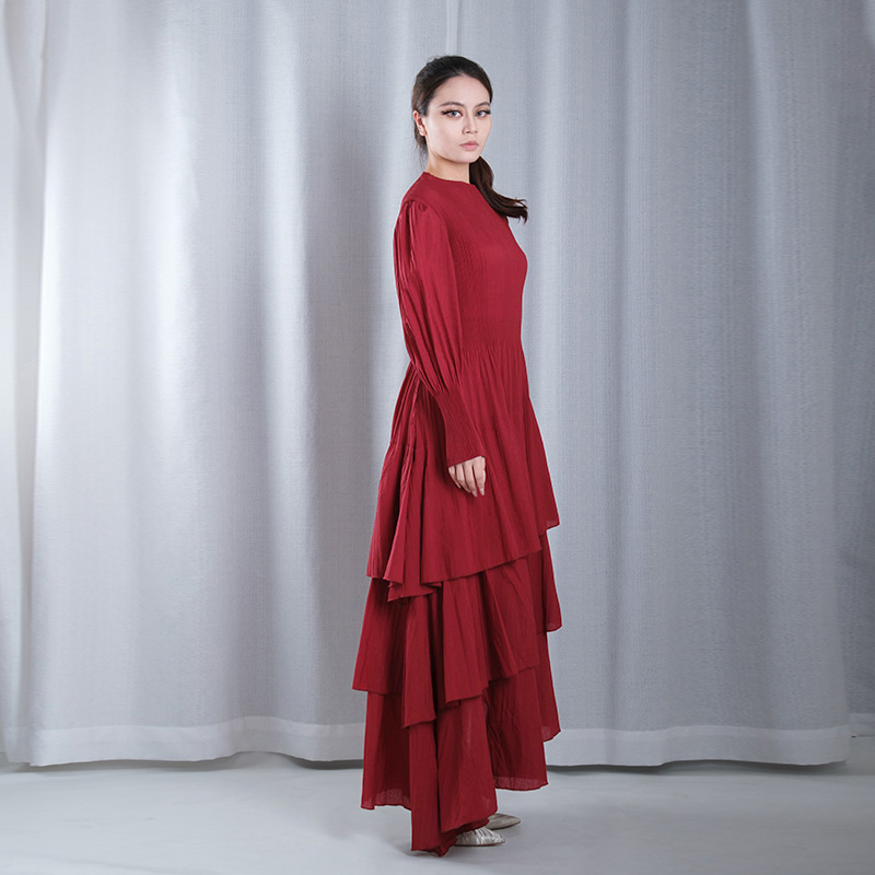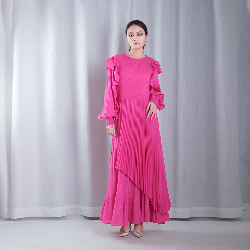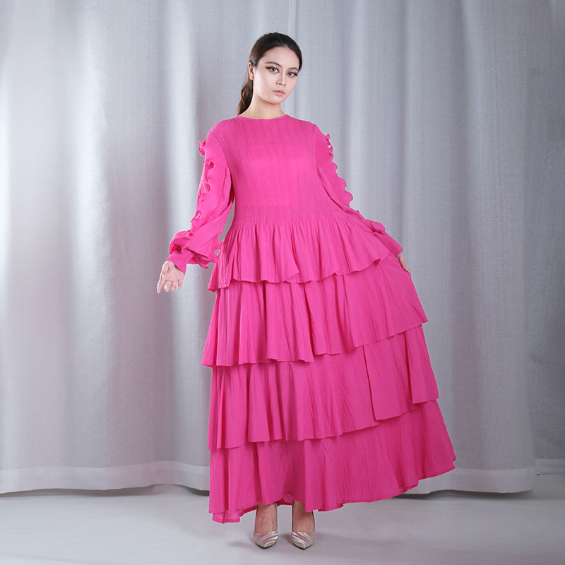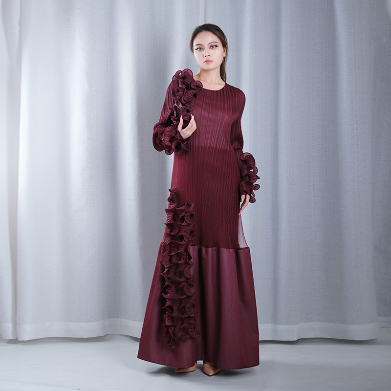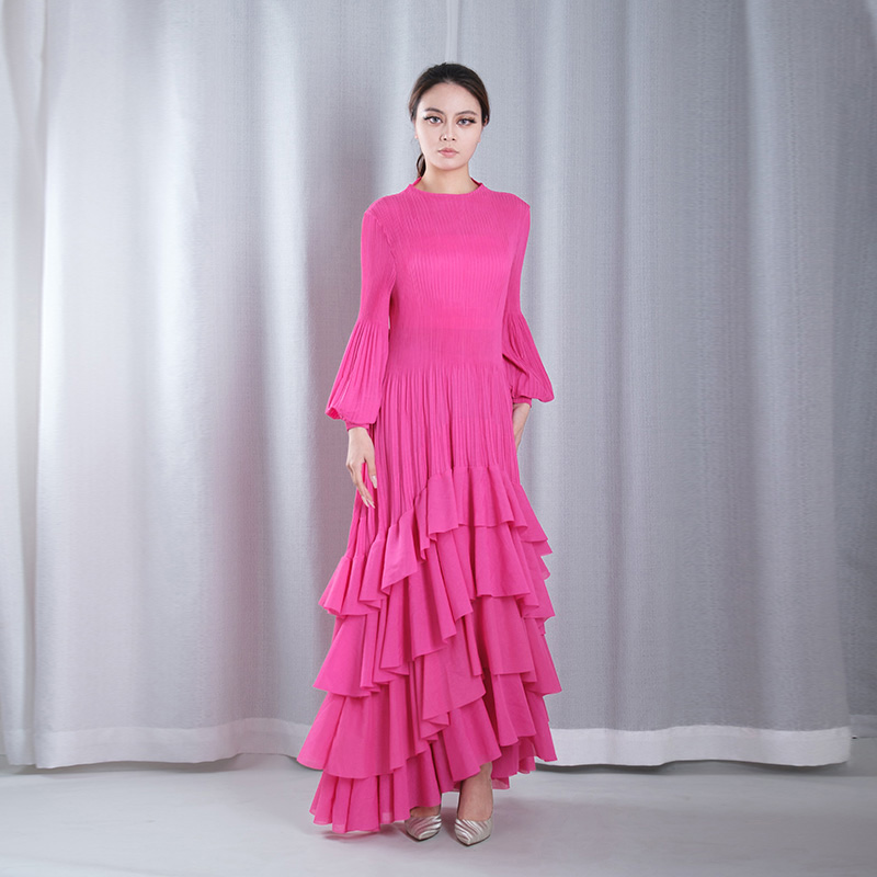 solid color pleated mesh ruffle round neck long sleeve straight loose full dresses evening gowns in red