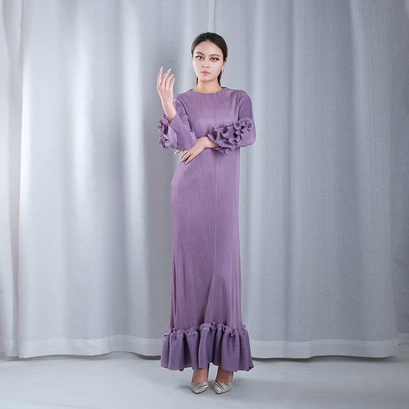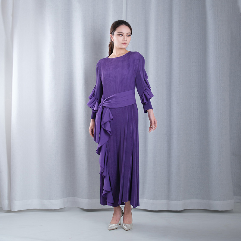 solid color pleated ruffle slit sleeve ruffled hemline loose maxi dresses evening gowns plus sizes in purple
