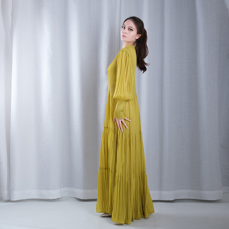 solid color pleated boat Neck lantern sleeve A-line hem loose maxi dresses evening gowns plus sizes in yellow