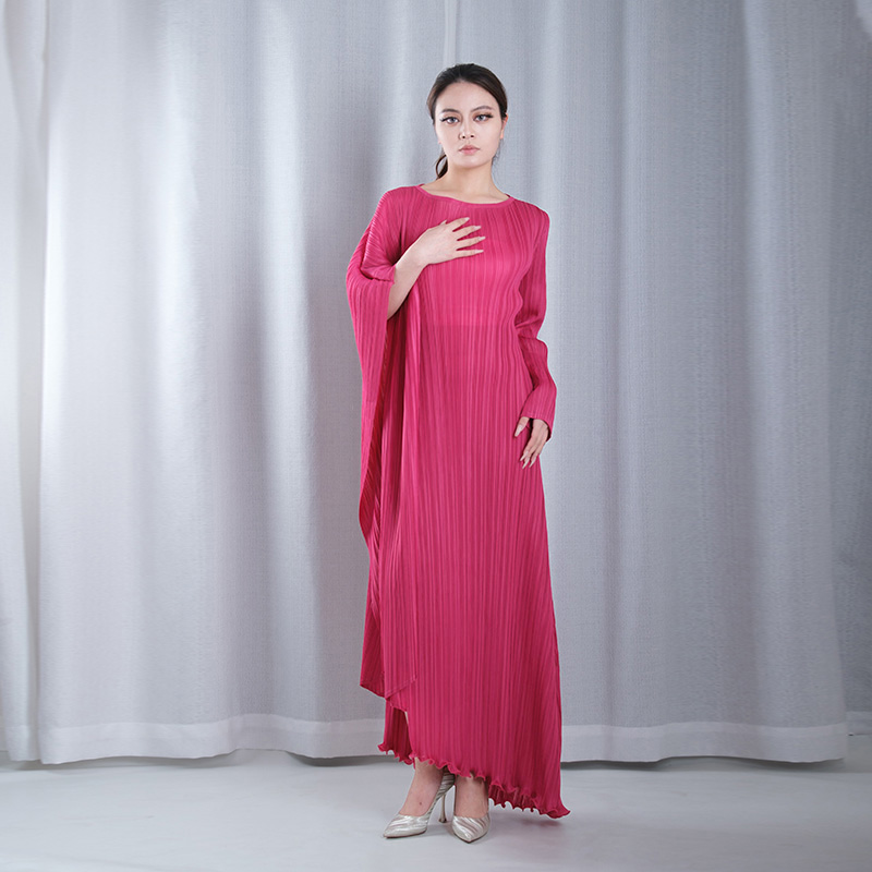 solid color pleated boat Neck asymmetrical sleeve asymmetrical hemline maxi dresses evening gowns in pink