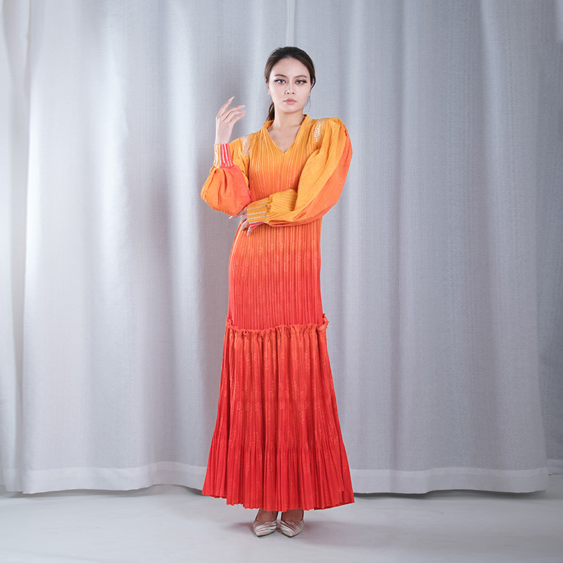 ombre pleated v neck lantern sleeve mermaid hem loose maxi dresses evening gowns in orange