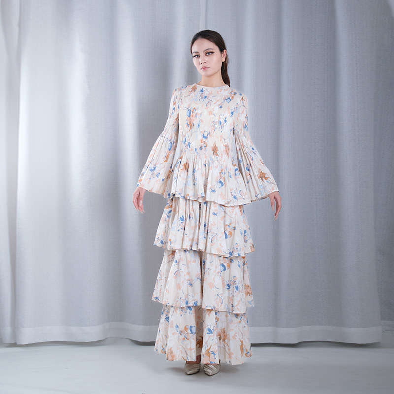 floral pattern multicolored pleated overlay ruffle round neck lantern sleeve asymmetrical hemline loose full dresses for banquet dance wear plus sizes in pink