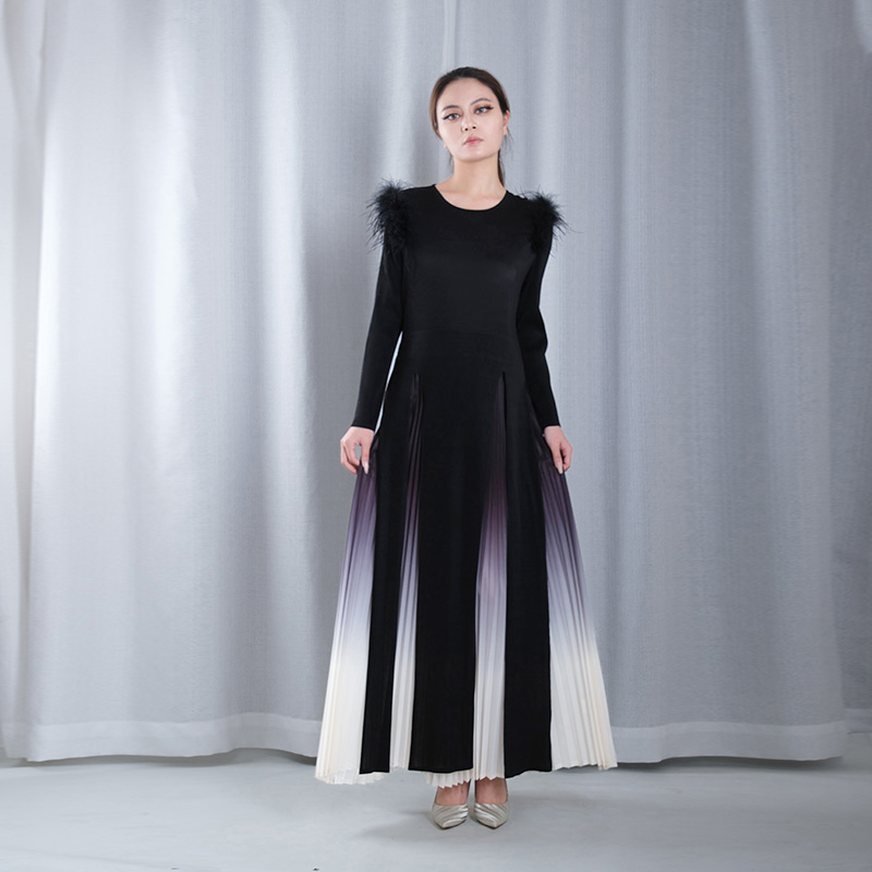 ombre pleated fuzzy round neck long sleeve A-line hem maxi dresses dance wear in black