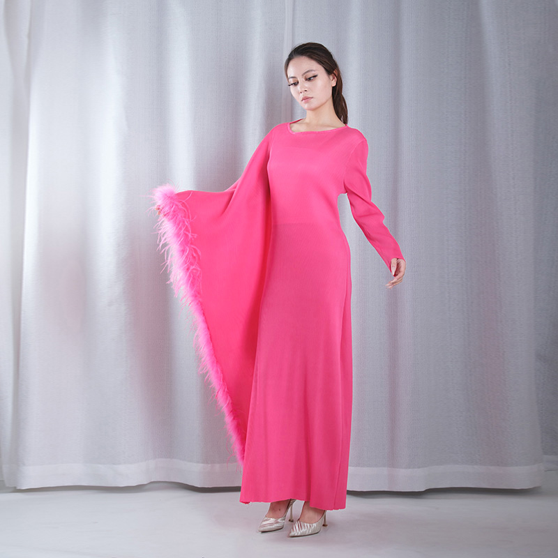 solid color pleated fuzzy boat Neck asymmetrical sleeve asymmetrical hemline maxi dresses evening gowns in pink