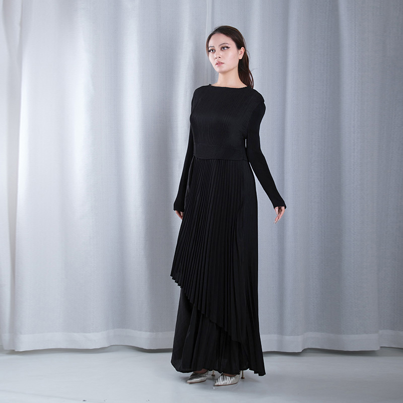 solid color pleated boat Neck long sleeve asymmetrical hemline loose maxi dresses dance wear plus sizes in black