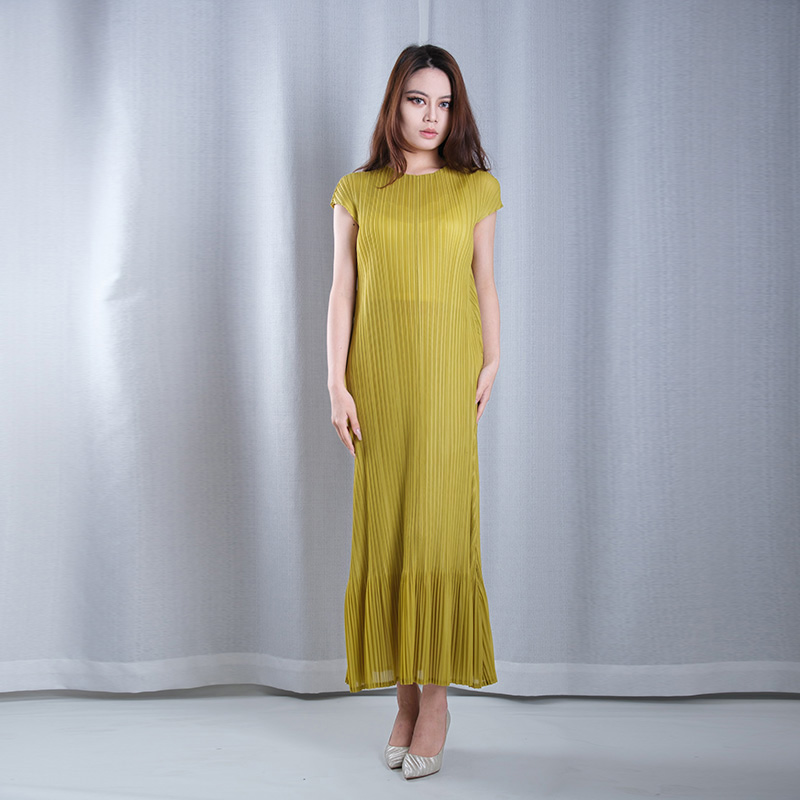 stripe pattern multicolored pleated boat Neck sleeveless A-line hem maxi dresses casual wear in yellow