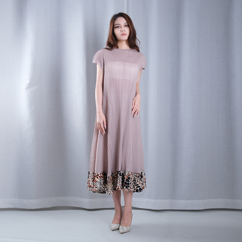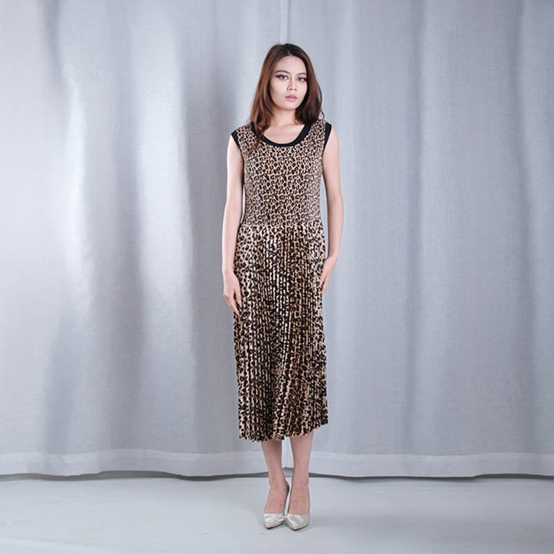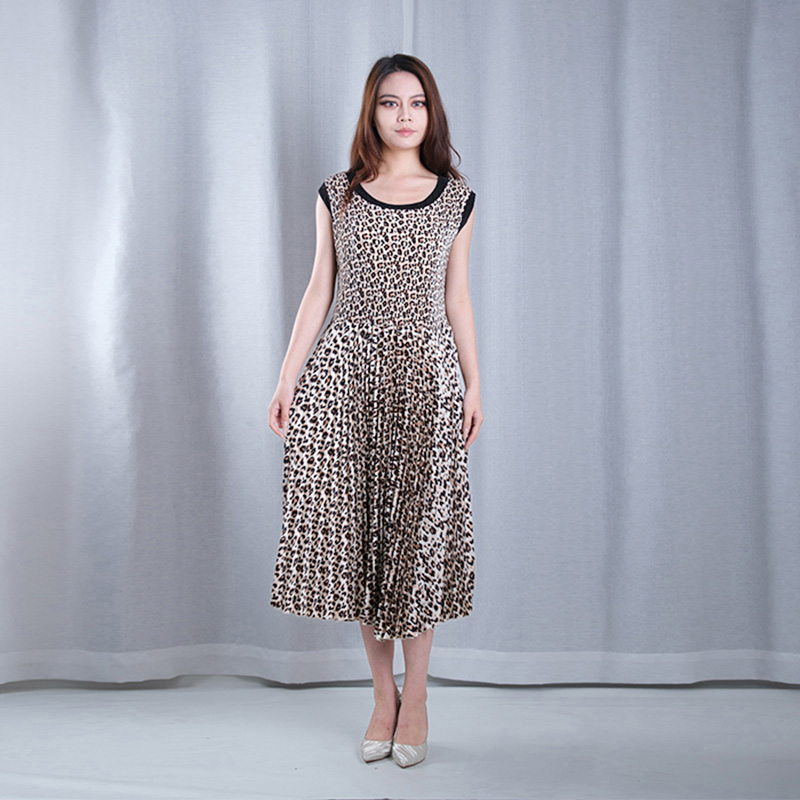 leopard pattern pleated round neck sleeveless A-line hem midi dresses casual wear dance wear in brown