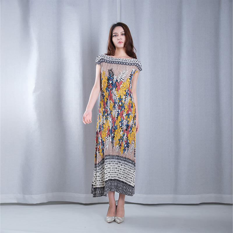 floral pattern multicolored pleated boat Neck sleeveless asymmetrical hemline loose maxi dresses casual wear for vacation in brown