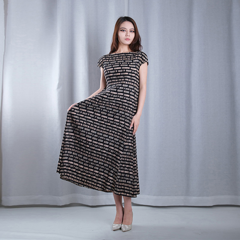 plaid design pleated boat Neck sleeveless A-line hem maxi dresses casual wear