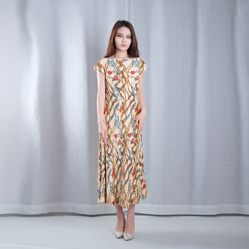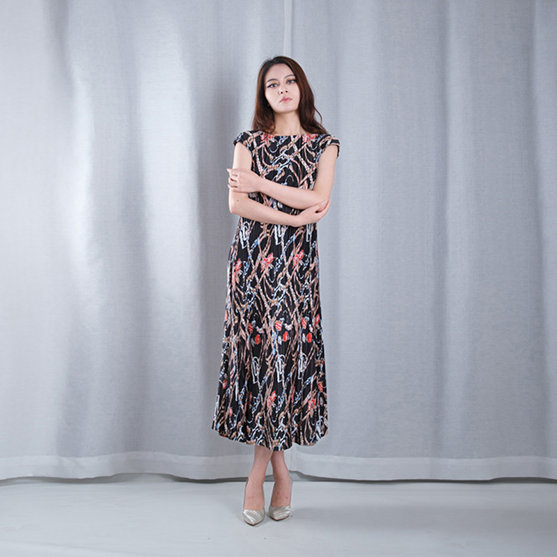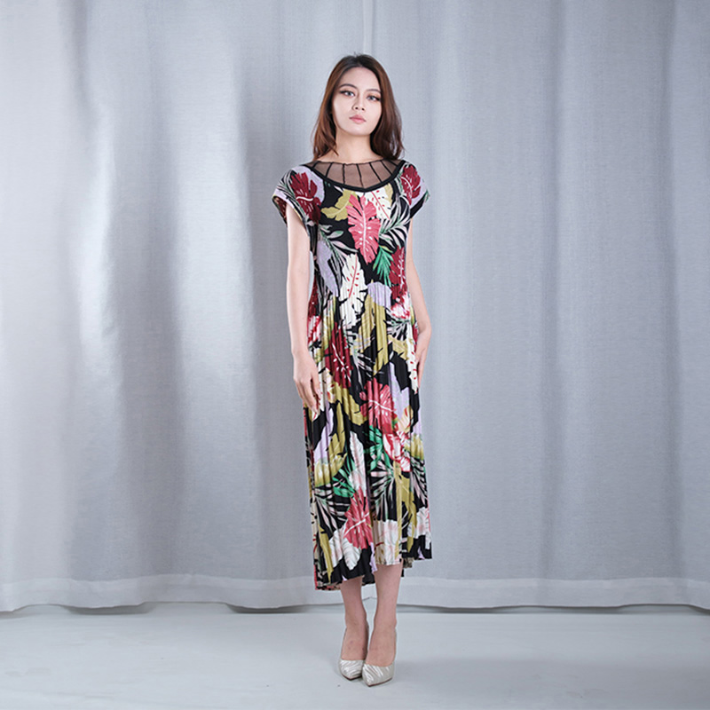 floral pattern multicolored pleated mesh boat Neck sleeveless A-line hem midi dresses casual wear