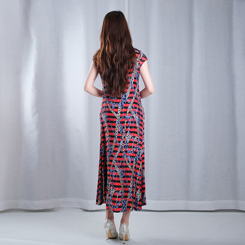 leopard pattern multicolored pleated boat Neck short sleeve A-line hem loose maxi dresses dance wear plus sizes in red