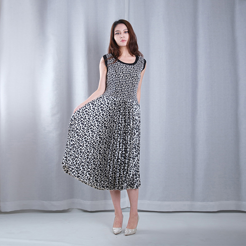 leopard pattern pleated round neck sleeveless A-line hem midi dresses casual wear dance wear in white