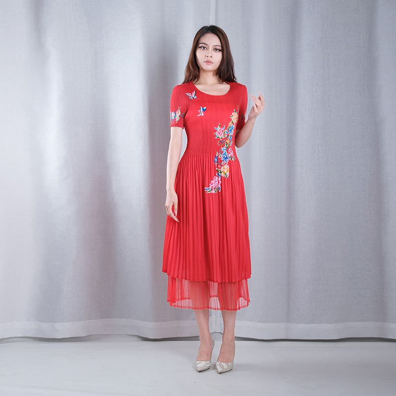 butterfly pattern multicolored pleated overlay mesh hand-beaded round neck short sleeve A-line hem midi dresses bridesmaid dress in red