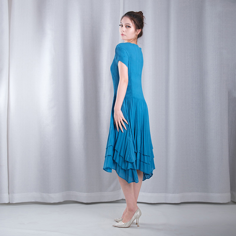 solid color pleated overlay square neck short sleeve A-line hem midi dresses dance wear in blue