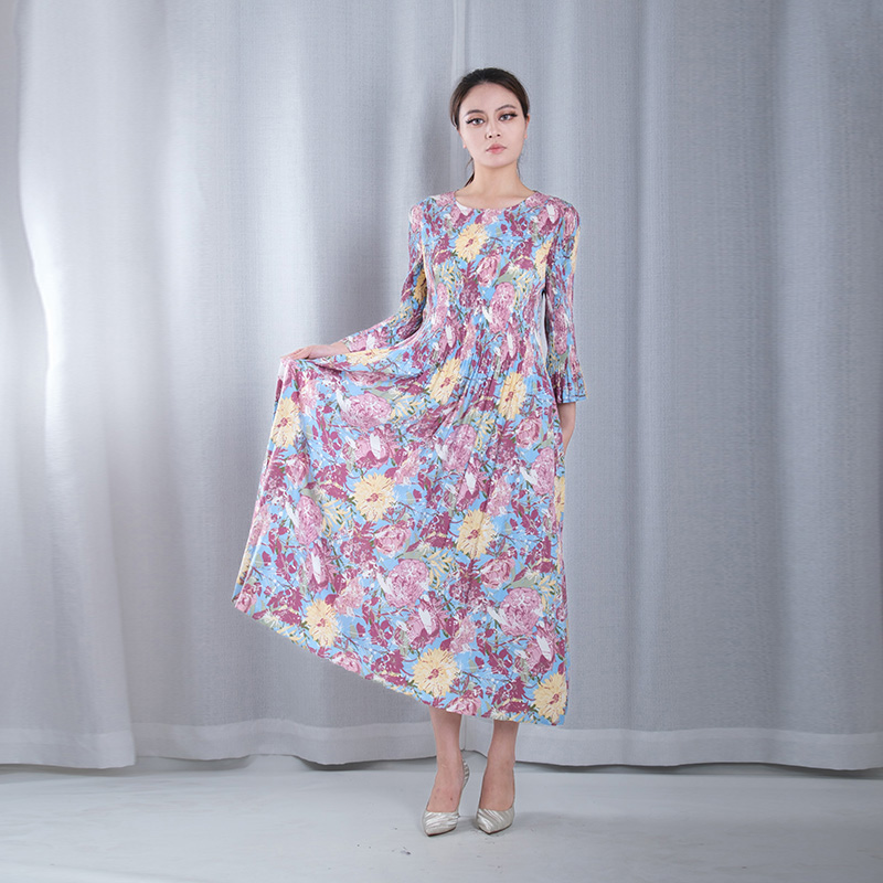 floral pattern multicolored pleated round neck flounce sleeve A-line hem tea dressed casual wear for vacation in pink