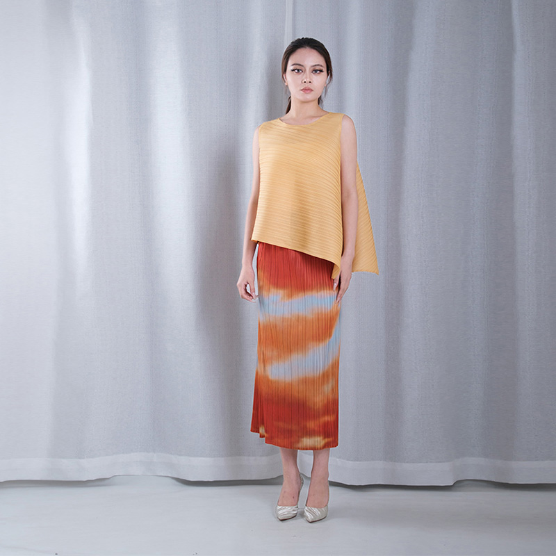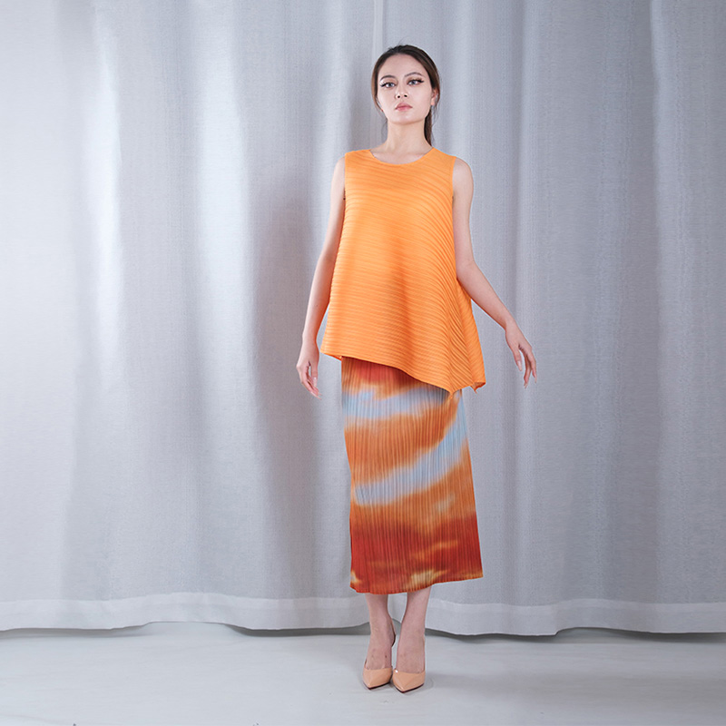 tie dye multicolored pleated round neck sleeveless straight tea dressed casual wear in orange